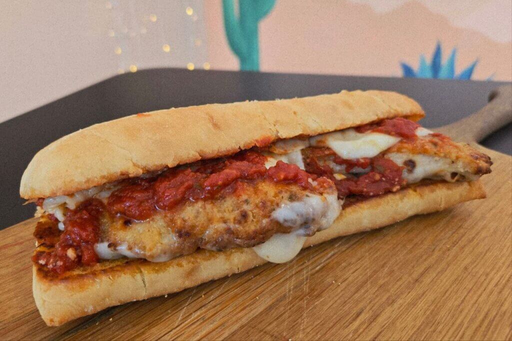 Delicious tender parmesan crusted chicken breast (no antibiotic) with house-made marinara sauce, melty Provolone cheese on a grilled sub roll with side of giardiniera is a must try sandwich.